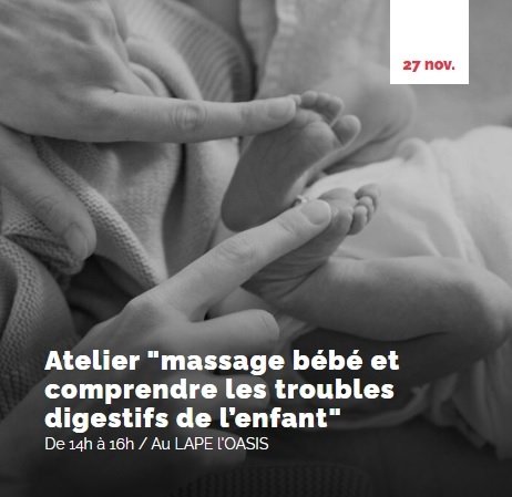La Caisse d'Allocation Familiale et Les Insatiables vous proposent un atelier « massage bébé et comprendre les troubles digestifs de l'enfant », le jeudi 27 novembre de 14h à 16h, au LAPE L'Oasis.