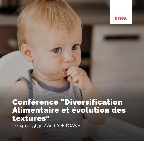 La Caisse d'Allocation Familiale et Les Insatiables vous proposent une conférence sur la thématique de la « diversification alimentaire et évolution des textures », le jeudi 6 novembre de 14h à 15h30, au LAPE L'Oasis.